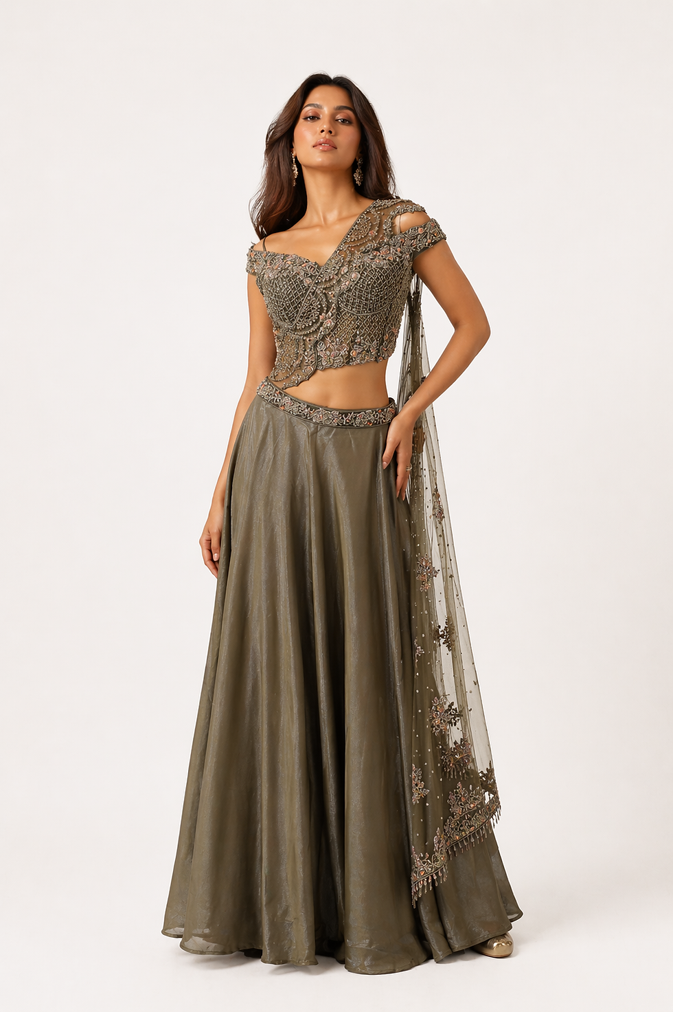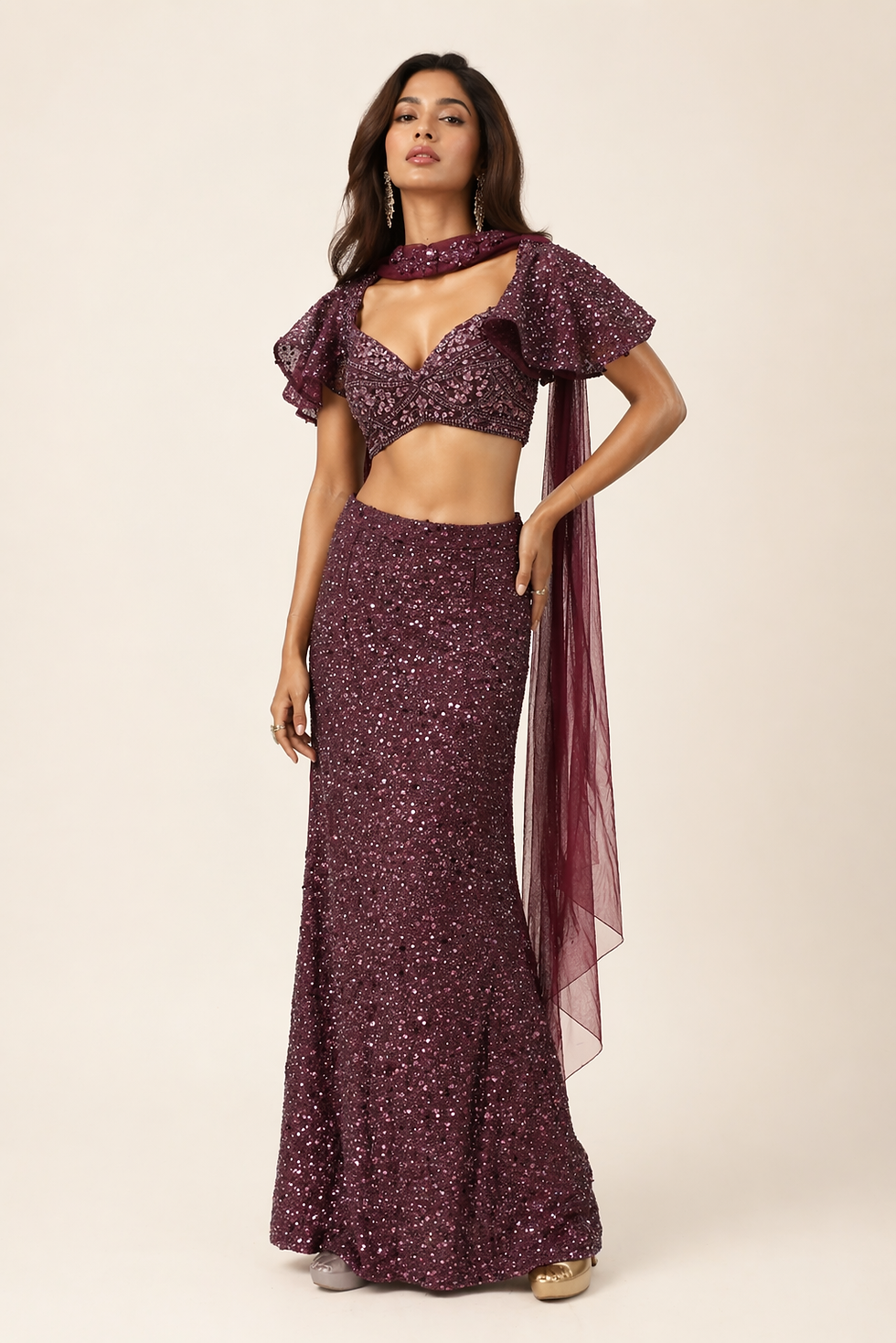 Crafted in a rich, deep hue that flatters every skin tone, this outfit features a beautifully embroidered structured blousewith intricate patterns that add depth and texture. The flowy skirt drapes gracefully, creating a flattering silhouette that moves with you, making it perfect for festive occasions, weddings, or evening celebrations.